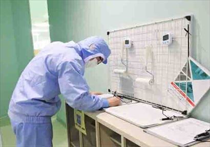 人が加工エリアに入場の際は指定のユニフォームに着替え、靴を履き替え入室記録を記入します。次に粘着ロールにて全身のホコリ等を取り、手洗い→アルコールでの手指消毒→服装チェックとします。